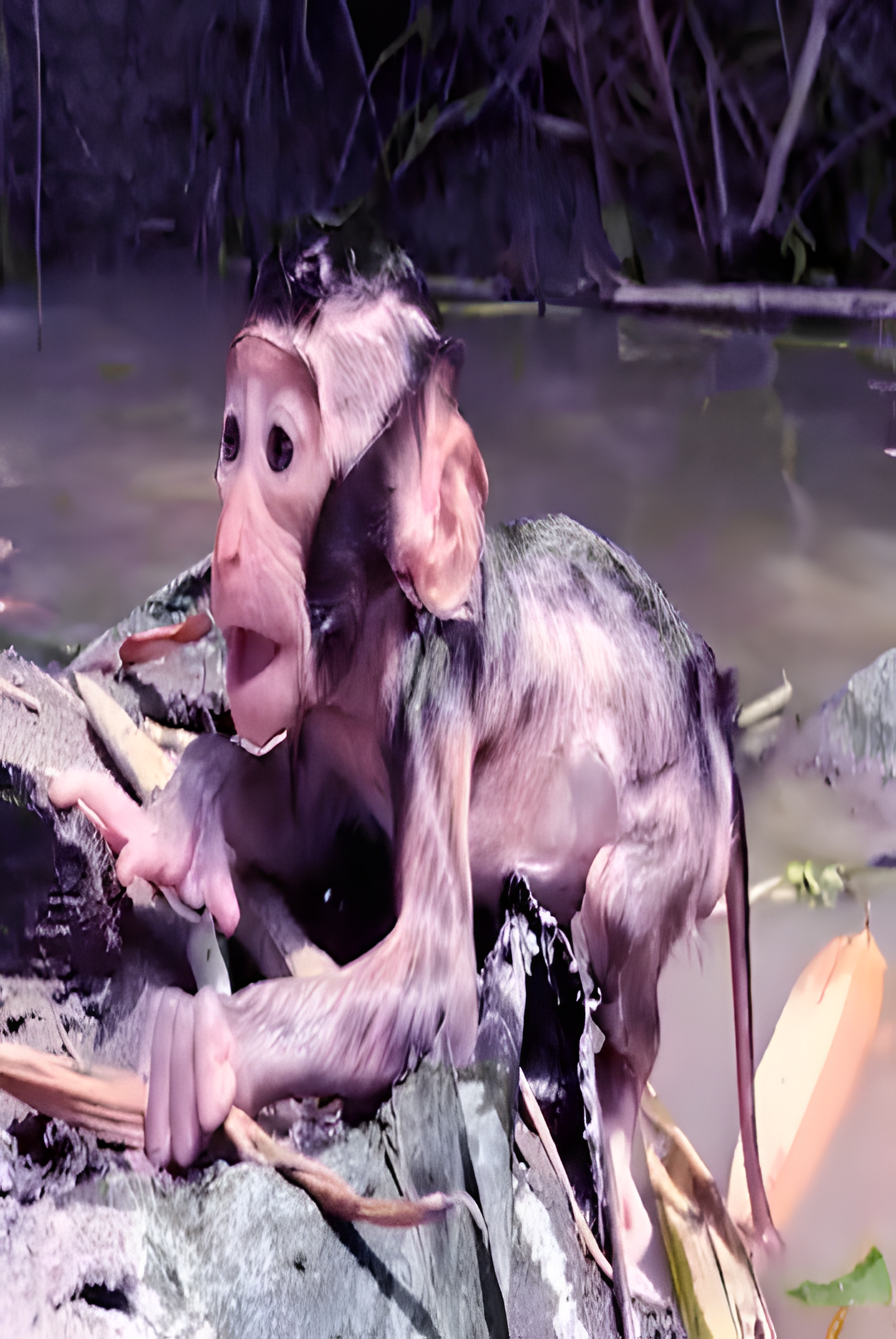 A touching moment was recently captured showing a tiny baby monkey caught in a stream of flowing water, barely able to hold itself steady.